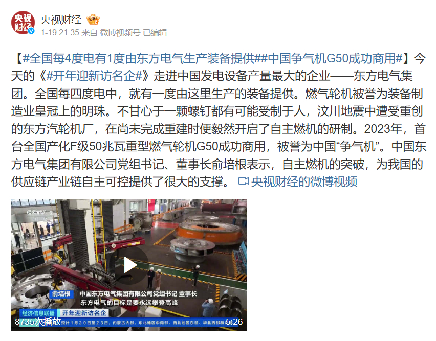 【#全國每4度電有1度由東方電氣生產(chǎn)裝備提供##中國爭氣機(jī)G50成功商用#】今天的《#開年迎新訪名企#》走進(jìn)中國發(fā)電設(shè)備產(chǎn)量最大的企業(yè)——東方電氣集團(tuán)。全國每四度電中,就有一度由這里生產(chǎn)的裝備提供。燃?xì)廨啓C(jī)被譽(yù)為裝備制造業(yè)皇冠上的明珠。不甘心于一顆螺釘都有可能受制于人,汶川地震中遭受重創(chuàng)的東方汽輪機(jī)廠,在尚未完成重建時(shí)便毅然開啟了自主燃機(jī)的研制。2023年,首臺全國產(chǎn)化F級50兆瓦重型燃?xì)廨啓C(jī)G50成功商用,被譽(yù)為中國“爭氣機(jī)”。中國東方電氣集團(tuán)有限公司黨組書記、董事長俞培根表示,自主燃機(jī)的突破,為我國的供應(yīng)鏈產(chǎn)業(yè)鏈自主可控提供了很大的支撐。