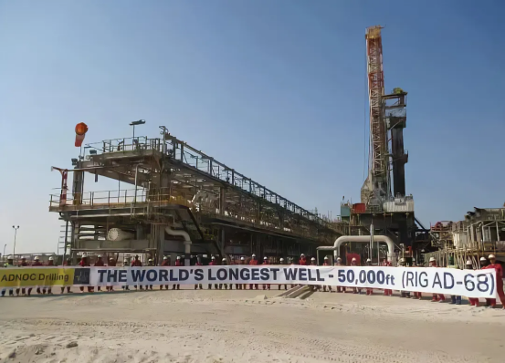 ▲2011年12月,東方宏華與該客戶簽訂9套3000HP人工島叢式井鉆機(jī)合同,并于2014年成功交付。該批次鉆機(jī)創(chuàng)造了世界上最長的16154米定向井長度紀(jì)錄,且全球最長的5口井均為該批次鉆機(jī)在阿布扎比的Zakum島完成。