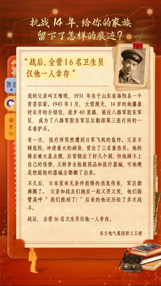 不久后,日本宣布無條件投降的消息傳來,軍區(qū)都沸騰了。父親和戰(zhàn)友們抱在一起又哭又笑,他們用振臂高呼“我們勝利了!”后來的他還歷經(jīng)了多次戰(zhàn)斗。戰(zhàn)后,全營(yíng)16名衛(wèi)生員僅他一人幸存。