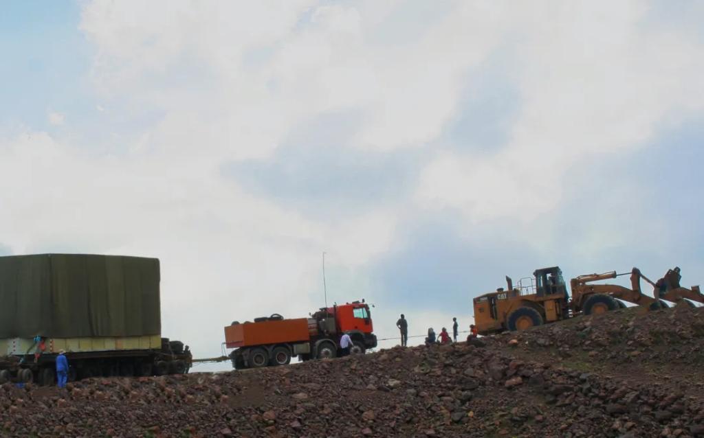 一切就緒,烏云密布的天空,宛如拉下了一塊巨大的黑色幕布。車輛嘶吼著前進(jìn),大馬力裝載機(jī)在車輛尾部“發(fā)狠”地往前推,轟鳴聲、摩擦聲、應(yīng)答聲……在異國(guó)他鄉(xiāng)上演著一場(chǎng)盛大的“交響音樂(lè)會(huì)”。