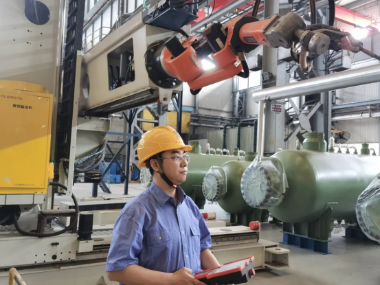 隨著“嗞”的電流聲響起,焊槍緩緩移動,生產(chǎn)制造部焊接骨干劉慶眉頭逐漸緊鎖,高度緊張,眼神緊盯焊點,手握機械臂操控柄,挪著小碎步精細(xì)操作,完全顧不上自己踩在超150℃高溫的十米高的操作臺上。
