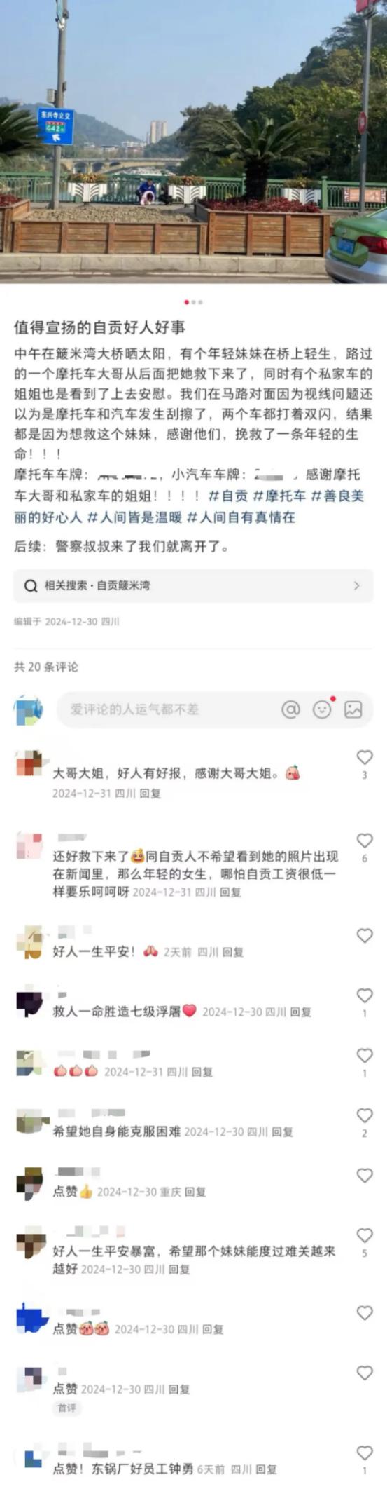 近日,在四川自貢簸米灣大橋上上演了暖心一幕:一位“摩托車大哥”挽救了一名意欲輕生的女孩。這一見義勇為的善舉被路人用鏡頭捕捉了下來。