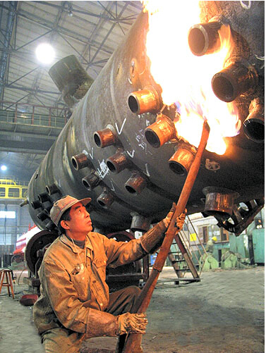 2005年,鐘家權(quán)光榮退休了,但是,摯愛(ài)東鍋的鐘家權(quán),在公司、車(chē)間領(lǐng)導(dǎo)和職工的關(guān)心支持下,又拿起了焊槍?zhuān)c昔日的伙伴們一起奮戰(zhàn)在核電工段,參與了廣東嶺澳核電站二期1000MW核島主設(shè)備制造。經(jīng)過(guò)1年時(shí)間的艱苦奮斗,2006年8月份,順利完成3臺(tái)安注箱的焊接任務(wù);2006年10月初,要求高、工作條件最為艱苦的1臺(tái)硼注射器焊接難關(guān)又被攻克了,為東方鍋爐按期履行合同做出了新的貢獻(xiàn)。在安注箱啟運(yùn)前的那一刻,鐘家權(quán)讓記者拍照留下了這一令他一輩子自豪而又難忘的瞬間……
