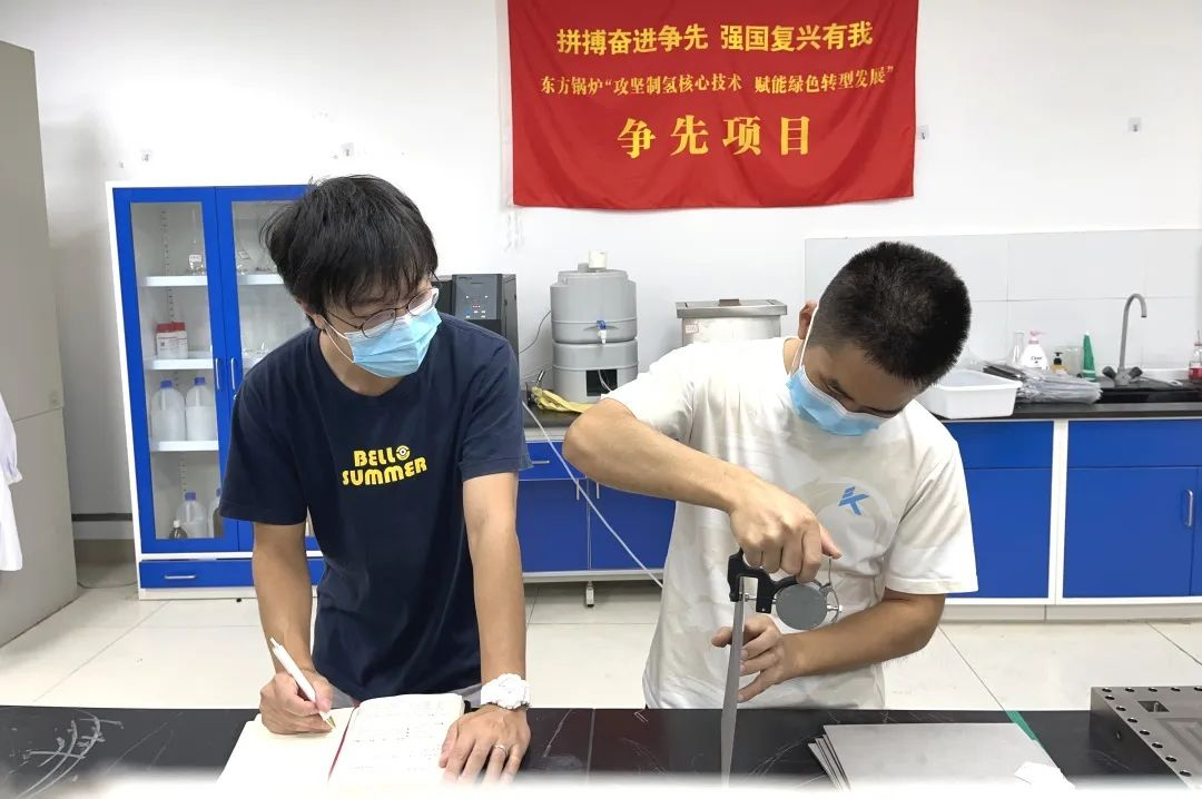 通過深入開展“三強三促”創(chuàng)先爭優(yōu)主題實踐活動,牽頭搭建“四川省氫能創(chuàng)新聯(lián)合體”等試驗平臺,東方鍋爐積極調(diào)動資源,為“爭先項目”攻關“開路”“架橋”。其中,技術創(chuàng)新中心黨委第五黨支部開展“創(chuàng)新助力轉型”專項行動,成立PEM電解水制氫技術黨員攻關隊,充分發(fā)揮黨員先鋒模范作用,形成“1名黨員帶頭、N名群眾爭先”聯(lián)動網(wǎng)絡,為核心技術攻關凝聚強大合力。加快實現(xiàn)產(chǎn)氫規(guī)模行業(yè)領先目標,必須盡快啃下“電解槽有效接觸面實現(xiàn)自由調(diào)控,且密封性能達到設計要求”這一“硬骨頭”。在接觸面積不可預測且無法測量的艱難條件下,攻關隊成員發(fā)揚“敢攻堅、勇克難”的斗爭精神,查閱大量文獻材料、召開多次分析討論會,開展晝夜不間斷實驗測試,對電解槽結構進行三次重大改進,不斷優(yōu)化實驗表征方法,終于順利完成PEM電解槽和電解系統(tǒng)設計。