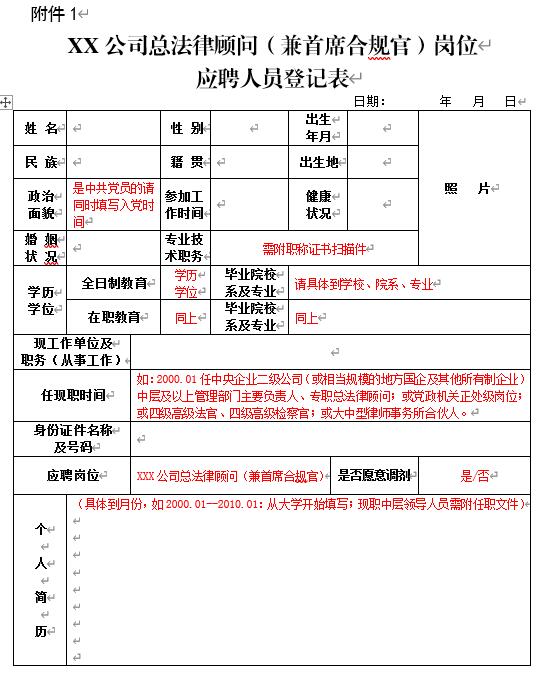 XX公司總法律顧問(兼首席合規(guī)官)崗位應聘人員登記表