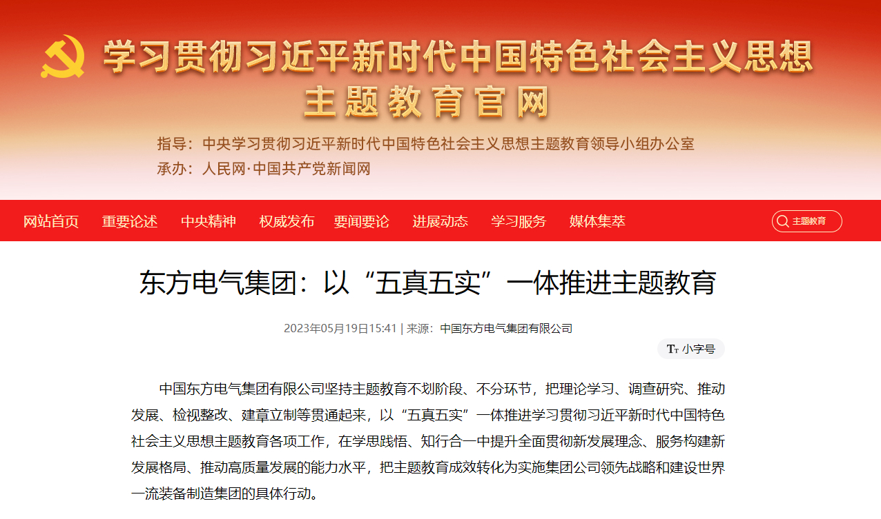 中國(guó)東方電氣集團(tuán)有限公司堅(jiān)持主題教育不劃階段、不分環(huán)節(jié),把理論學(xué)習(xí)、調(diào)查研究、推動(dòng)發(fā)展、檢視整改、建章立制等貫通起來(lái),以“五真五實(shí)”一體推進(jìn)學(xué)習(xí)貫徹習(xí)近平新時(shí)代中國(guó)特色社會(huì)主義思想主題教育各項(xiàng)工作,在學(xué)思踐悟、知行合一中提升全面貫徹新發(fā)展理念、服務(wù)構(gòu)建新發(fā)展格局、推動(dòng)高質(zhì)量發(fā)展的能力水平,把主題教育成效轉(zhuǎn)化為實(shí)施集團(tuán)公司領(lǐng)先戰(zhàn)略和建設(shè)世界一流裝備制造集團(tuán)的具體行動(dòng)。