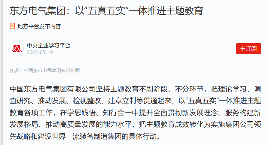 中國(guó)東方電氣集團(tuán)有限公司堅(jiān)持主題教育不劃階段、不分環(huán)節(jié),把理論學(xué)習(xí)、調(diào)查研究、推動(dòng)發(fā)展、檢視整改、建章立制等貫通起來,以“五真五實(shí)”一體推進(jìn)主題教育各項(xiàng)工作,在學(xué)思踐悟、知行合一中提升全面貫徹新發(fā)展理念、服務(wù)構(gòu)建新發(fā)展格局、推動(dòng)高質(zhì)量發(fā)展的能力水平,把主題教育成效轉(zhuǎn)化為實(shí)施集團(tuán)公司領(lǐng)先戰(zhàn)略和建設(shè)世界一流裝備制造集團(tuán)的具體行動(dòng)。