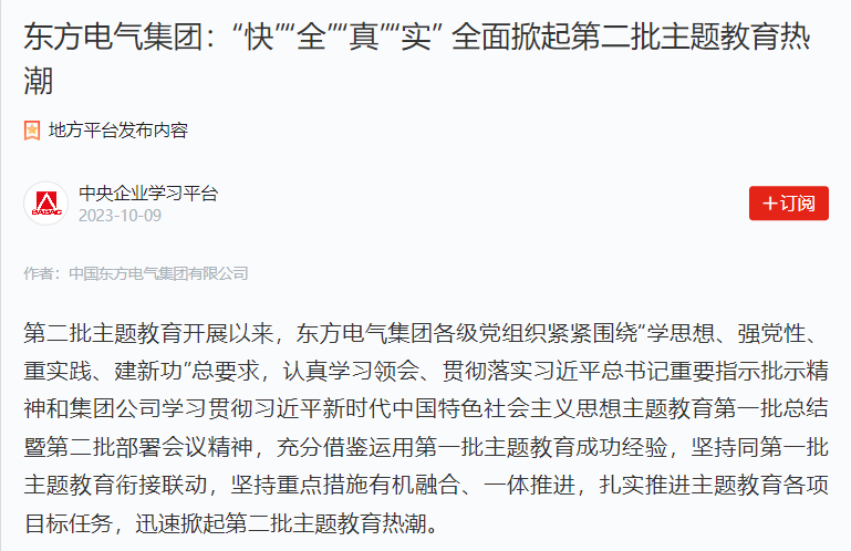 第二批主題教育開展以來,東方電氣集團各級黨組織緊緊圍繞“學思想、強黨性、重實踐、建新功”總要求,認真學習領會、貫徹落實習近平總書記重要指示批示精神和集團公司學習貫徹習近平新時代中國特色社會主義思想主題教育第一批總結(jié)暨第二批部署會議精神,充分借鑒運用第一批主題教育成功經(jīng)驗,堅持同第一批主題教育銜接聯(lián)動,堅持重點措施有機融合、一體推進,扎實推進主題教育各項目標任務,迅速掀起第二批主題教育熱潮。