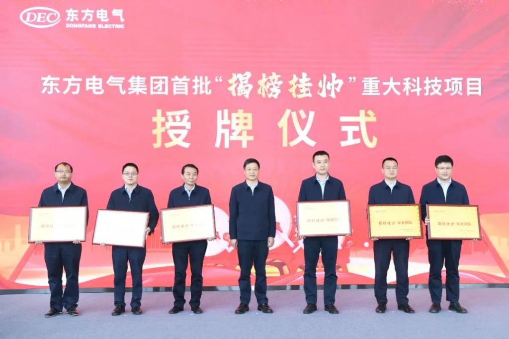 ▲2022年3月23日,東方電氣集團(tuán)舉行首批“揭榜掛帥”重大科技項(xiàng)目授牌及啟動儀式,集團(tuán)公司黨組書記、董事長俞培根向揭榜團(tuán)隊(duì)負(fù)責(zé)人授牌