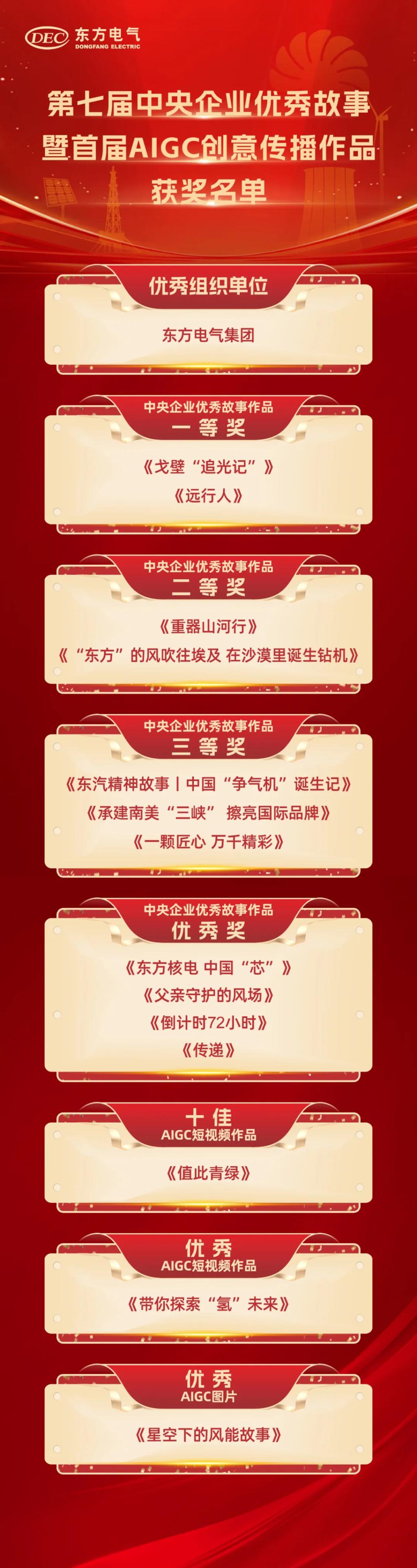 其中,《戈壁“追光記”》《遠(yuǎn)行人》榮獲中央企業(yè)優(yōu)秀故事作品一等獎,《重器山河行》《“東方”的風(fēng)吹往埃及 在沙漠里誕生鉆機(jī)》榮獲中央企業(yè)優(yōu)秀故事作品二等獎,《東汽精神故事丨中國“爭氣機(jī)”誕生記》《承建南美“三峽”擦亮國際品牌》《一顆匠心 萬千精彩》榮獲中央企業(yè)優(yōu)秀故事作品三等獎,《東方核電 中國“芯”》《父親守護(hù)的風(fēng)場》《倒計時72小時》《傳遞》榮獲中央企業(yè)優(yōu)秀故事作品優(yōu)秀獎,《值此青綠》獲評十佳AIGC短視頻作品,《帶你探索“氫”未來》獲評優(yōu)秀AIGC短視頻作品,《星空下的風(fēng)能故事》獲評優(yōu)秀AIGC圖片。
