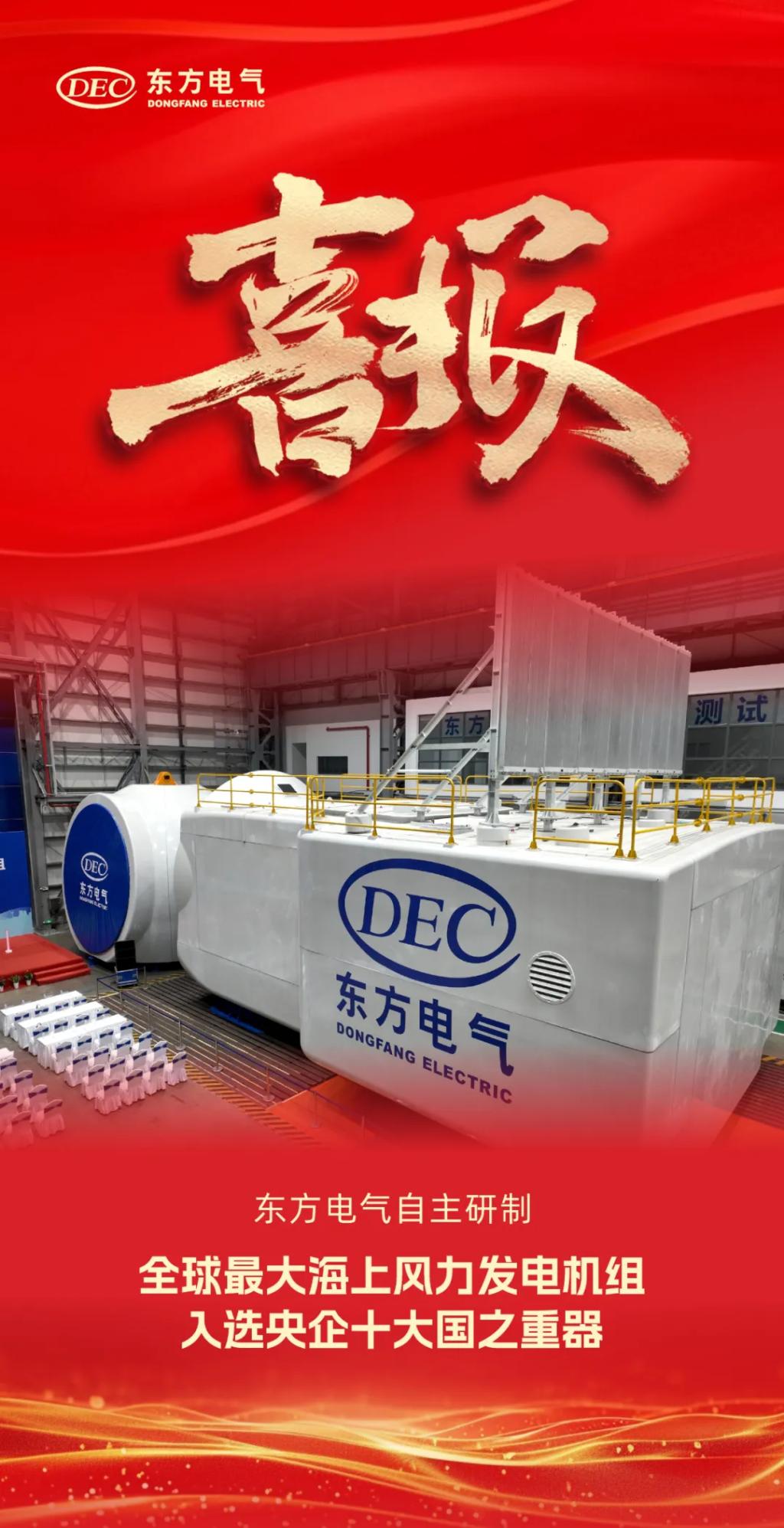1月1日,國務(wù)院國資委新聞中心正式發(fā)布2024年度央企十大國之重器,由東方電氣研制的“全球最大海上風(fēng)力發(fā)電機組”成功入選。繼“全新一代18兆瓦海上直驅(qū)風(fēng)電機組”后,東方電氣海上風(fēng)電產(chǎn)品再次入選央企十大國之重器。