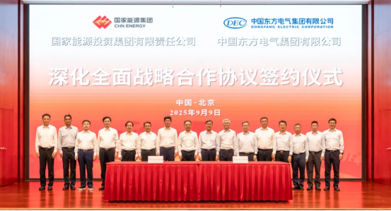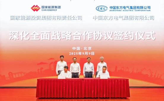 9月9日,中國(guó)東方電氣集團(tuán)有限公司與國(guó)家能源投資集團(tuán)有限責(zé)任公司在京簽署深化全面戰(zhàn)略合作協(xié)議。東方電氣集團(tuán)黨組書(shū)記、董事長(zhǎng)羅乾宜,總經(jīng)理、黨組副書(shū)記張彥軍,國(guó)家能源集團(tuán)黨組書(shū)記、董事長(zhǎng)鄒磊,總經(jīng)理、黨組副書(shū)記馮來(lái)法共同見(jiàn)證協(xié)議簽署。東方電氣集團(tuán)黨組成員、副總經(jīng)理王軍,國(guó)家能源集團(tuán)黨組成員、副總經(jīng)理傅振邦代表雙方簽署協(xié)議。